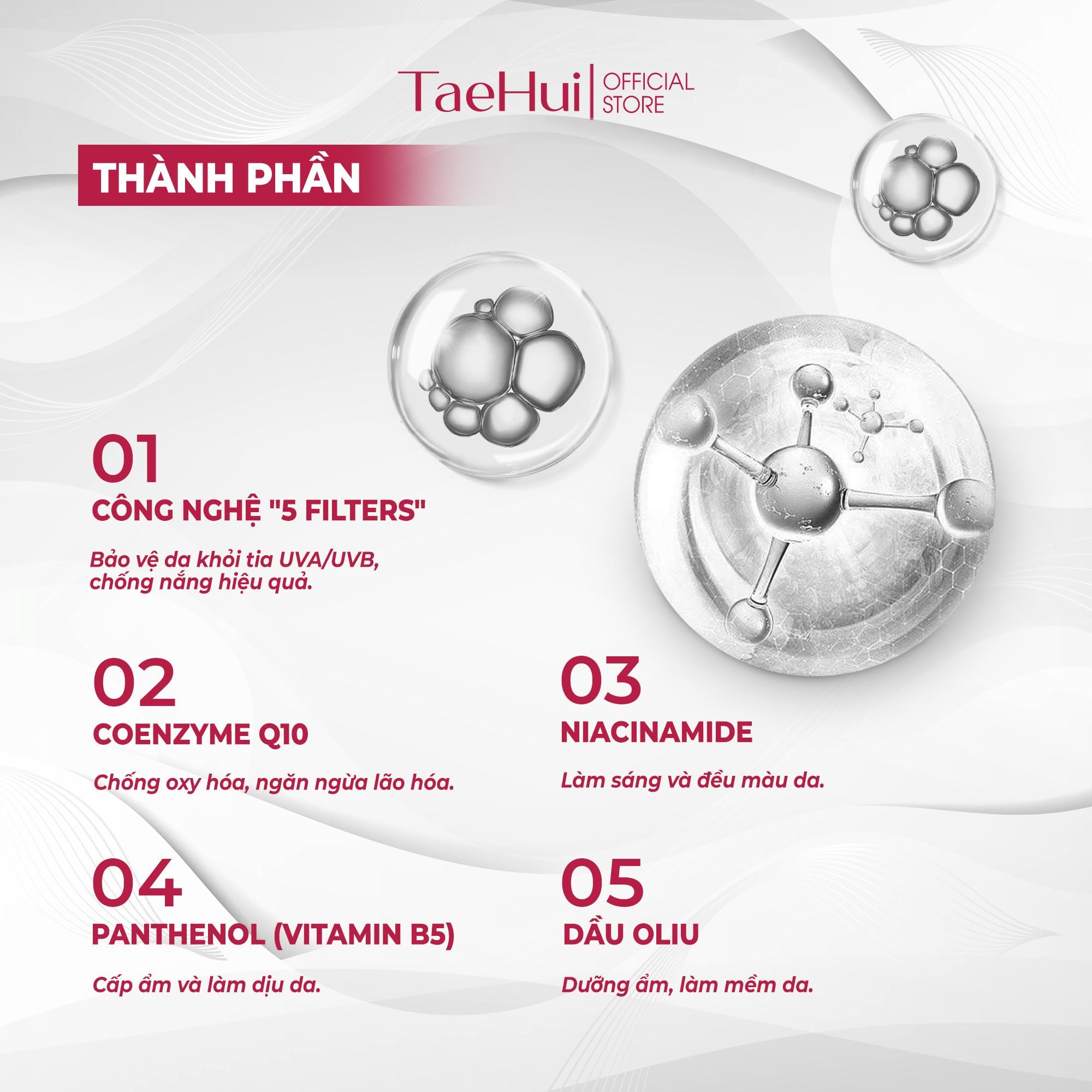 Kem Chống Nắng TaeHui SPF50+ Niacinamide & Coenzyme Q10 cho da mặt và body phổ rộng với chỉ số SPF 50+, PA +++ giúp bảo vệ da khỏi tác hại của tia UVA, UVB và các tác nhân gây hại cho da từ môi trường như khói bụi. Với công thức 5 màng lọc kết hợp với Coenzyme Q10, Niacinamide, Panthenol (Vitamin B5) và dầu Olive giúp bảo vệ da khỏi các gốc tự do có hại cho da, ngăn ngừa lão hoá da sớm, giúp da trở nên sáng, mềm mại, mịn màng và đều màu hơn.