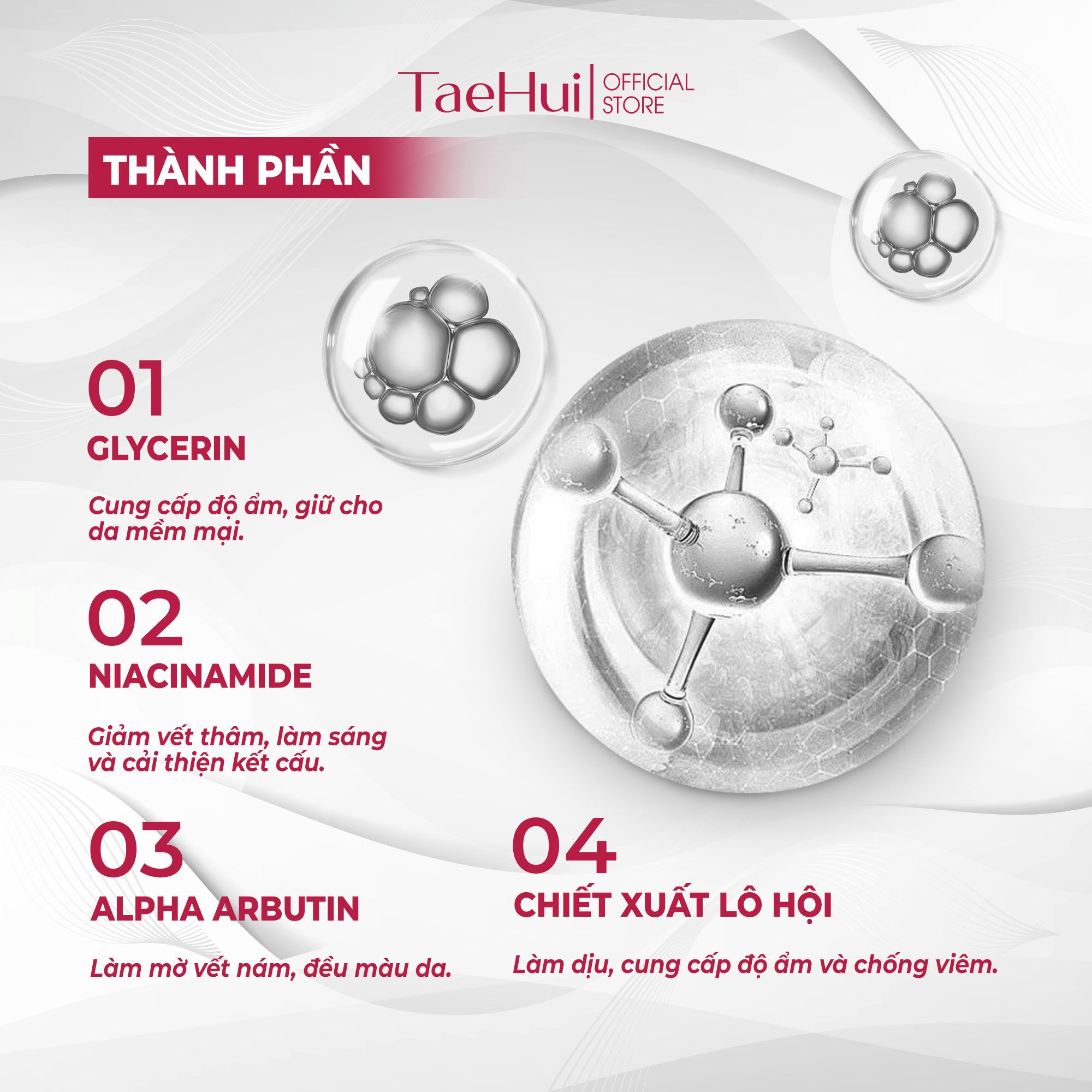 Kem Dưỡng Ban Đêm TaeHui White Night Trắng Da, Mờ Nám & Tái Tạo Da kết hợp Glycerin, Niacinamide, Alpha Arbutin và chiết xuất lô hội, giúp duy trì độ ẩm và đàn hồi cho da. Glycerin cung cấp độ ẩm, Niacinamide cải thiện kết cấu và làm sáng tông màu da, trong khi Alpha Arbutin giảm các đốm sắc tố không mong muốn. Chiết xuất lô hội làm dịu và cung cấp chất chống oxi hóa, bảo vệ da khỏi tác nhân gây hại, giúp da luôn căng bóng và khỏe mạnh.