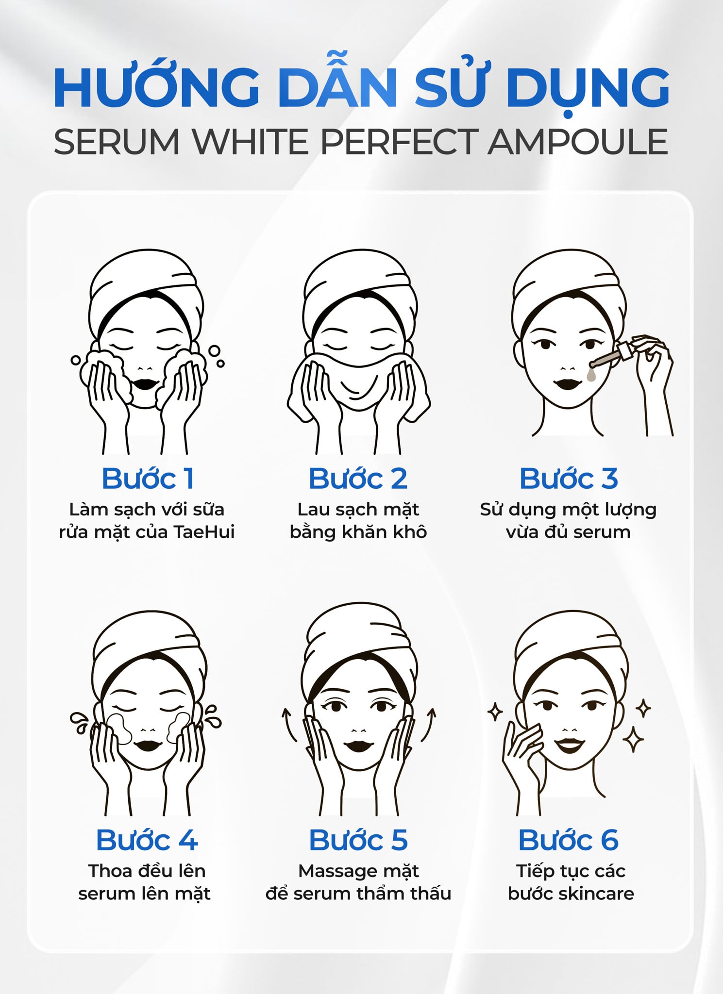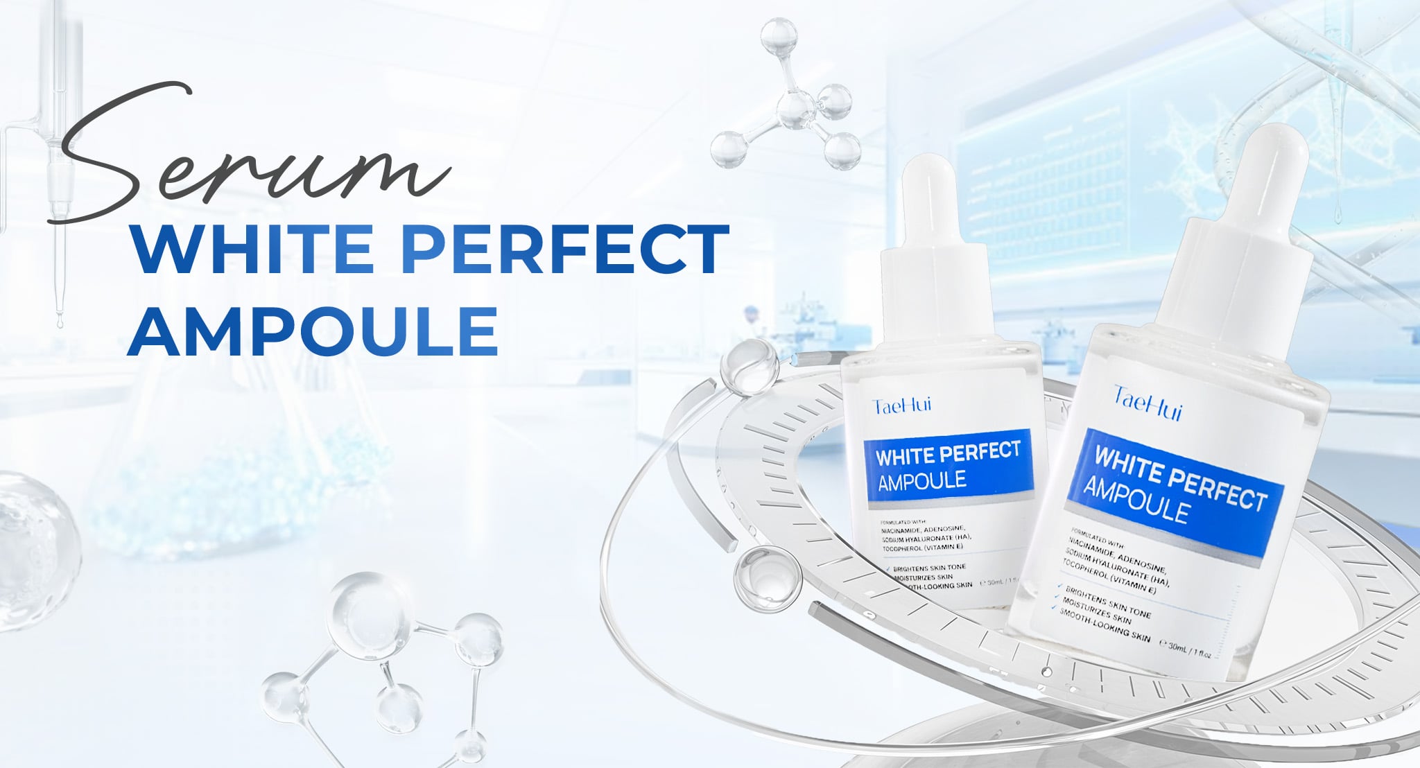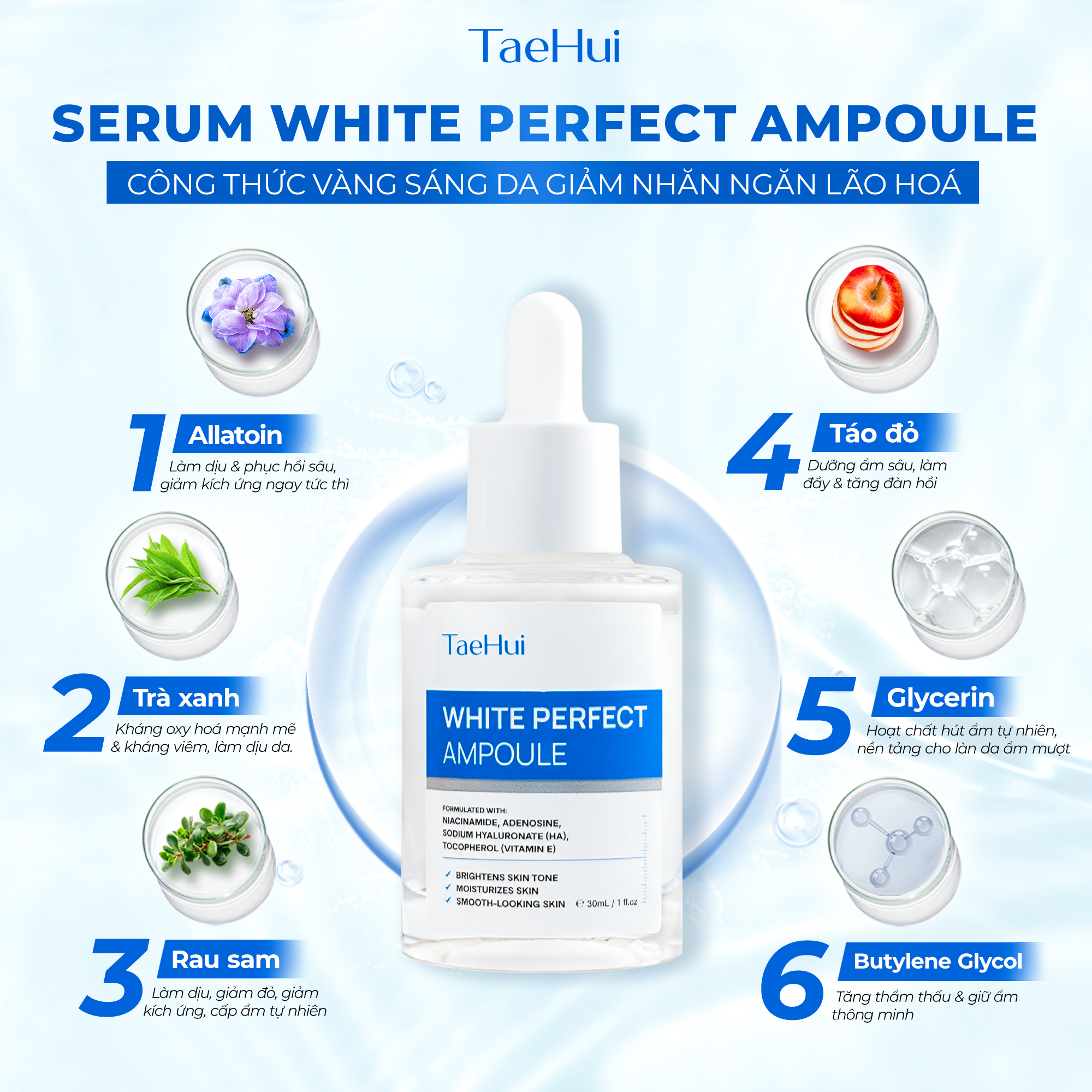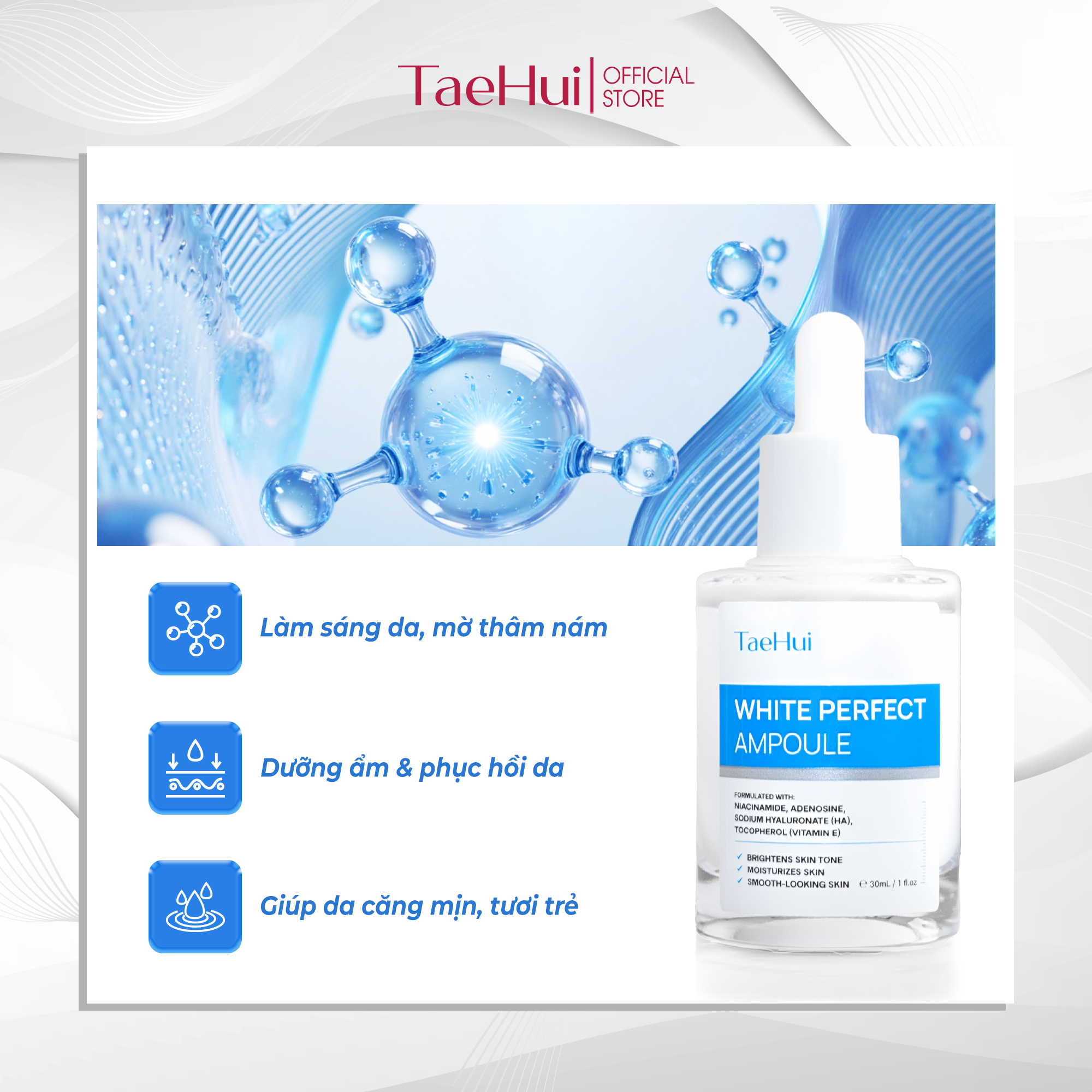 White Perfect Ampoule là dòng serum cấp ẩm, dưỡng trắng, chống lão hoá chuyên sâu mới nhất của Taehui, ứng dụng bộ bốn hoạt chất vàng làm trắng thế hệ mới, mang lại hiệu quả cấp ẩm vượt trội, dưỡng da trắng sáng đều màu, đặc biệt giúp chống lão hoá, ngăn ngừa nếp nhăn an toàn, hiệu quả.