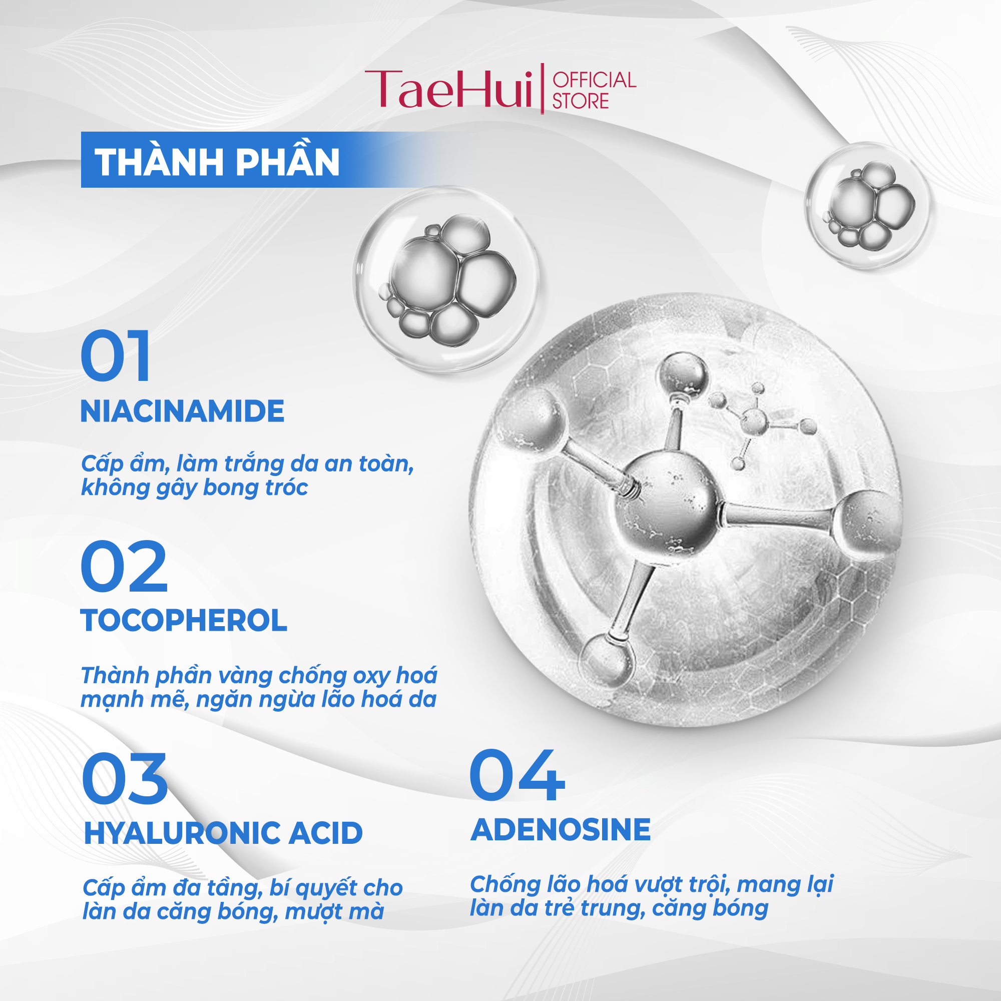- Adenosine: Chống nhăn, cải thiện đàn hồi, giảm dấu hiệu lão hóa, chống viêm và tái sinh tế bào